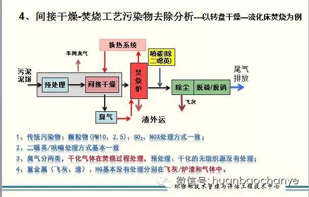 在以转盘干燥等间接干燥-焚烧工艺中,预处理和间接干燥成为第一个臭气排放单元;主流的干燥气体进入焚烧单元进行处理,最后的烟气经除尘、脱硫脱硝、去除二噁英等净化处理后排放出去,成为第二个排放单元;除尘产生的飞灰量大,且富集大量的重金属和二噁英,成为第三个排放单元。目前的示范工程除了采用国外的系统,基本都是这个技术路线。第二种以喷雾干燥等直接干燥-焚烧的工艺稍有不同,主要区别是干燥尾气没有经过焚烧炉,而是直接经过二噁英去除、除尘、脱硫脱硝,以及后续酸洗或者碱洗处理;直接干燥过程可能有臭味和挥发性有机物的释放,这些污染物可经过后续的氧化加以去除。实际上,不管是直接和间接干燥,都是成熟的工艺,只是对污染物控制有所侧重、有所不同。纵观污泥干化焚烧工艺,污染物主要包括四种类型,即传统污染物:尘,二氧化硫和氮氧化物;二是二噁英/呋喃等物质;这两类污染物的处理方法基本一致。第三类臭气和第四类重金属有所差异,如上所述间接干化焚烧臭气除焚烧处理外,存在预处理和干化单元的无组织源,重金属基本没有处理而残留在飞灰/炉渣和气体中;而直接干燥焚烧臭气无组织源很少,干化气体通过尾气净化工艺处理,重金属和Hg基本没有处理而残留在炉渣和气体中。