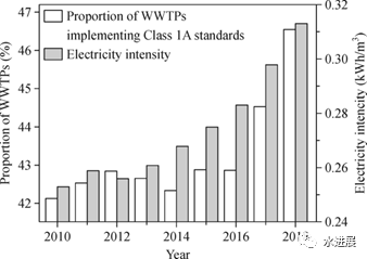 图3 中国污水处理厂执行一级A废水标准的比例和能源消耗强度