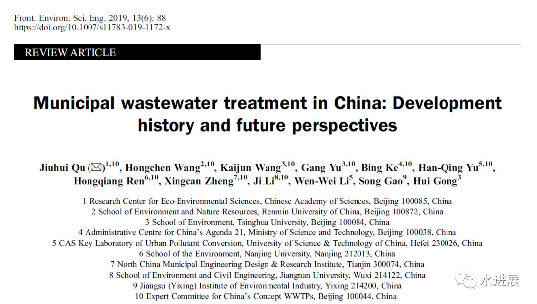 曲久辉院士团队近期在学术期刊《Front. Environ. Sci. Eng. 2019, 13(6): 88》发表文章:“Municipal wastewater treatment in China: Development history and future perspectives‘’,重庆大学赵志伟教授团队将文章翻译为中文,《水进展》发布全文翻译版。