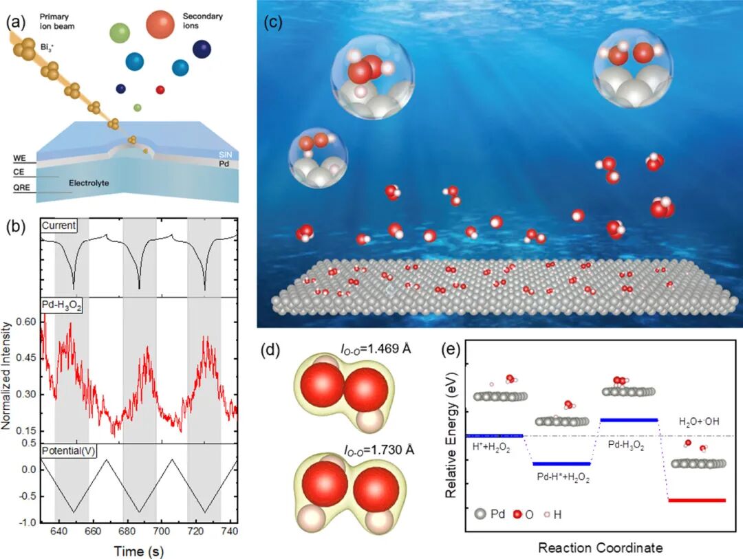 图3. (a) 原位二次离子质谱(ToF-SIMS)示意图;(b) Pd-H3O2的ToF-SIMS信号;(c) 绿色芬顿过程示意图;(d) H2O2和H2O2-H*模型的电荷密度;(e)绿色芬顿过程中的吉布斯自由能变化