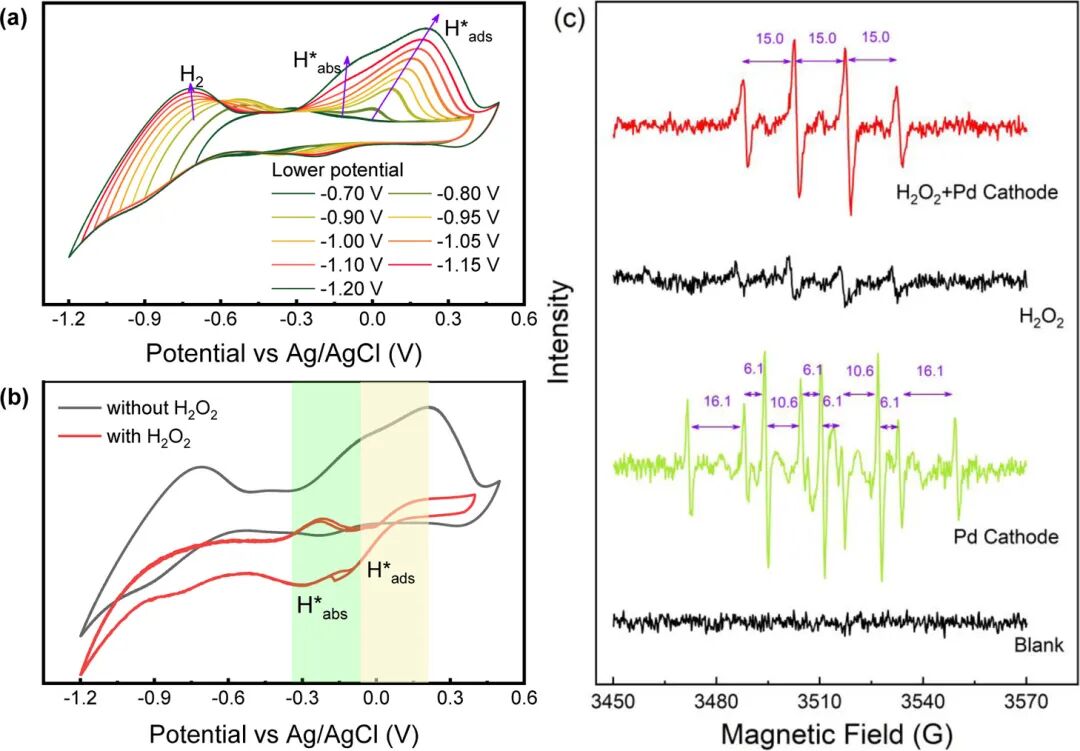 图2. 探究原子氢与双氧水的反应:原子氢的电化学表征 (a) 无双氧水 (b) 有双氧水;(c) 活性物种的ESR 表征