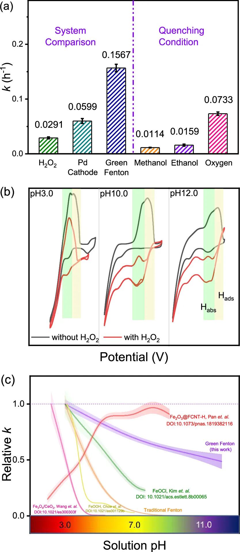 图4. (a) 绿色芬顿的相关过程的一级动力学常数比较;(b) 不同pH值条件下对Pd电极的CV扫描;(c)绿色芬顿受pH值的影响