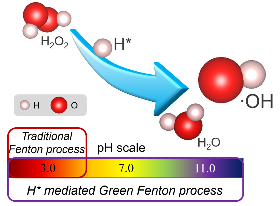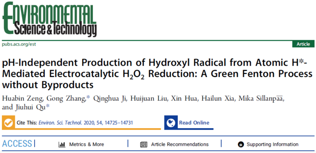 近日,清华大学曲久辉院士研究团队在环境领域顶级刊物《Environmental Science & Technology》上发表了题为“pH-Independent Production of Hydroxyl Radical from Atomic H*-Mediated Electrocatalytic H2O2 Reduction: A Green Fenton Process without Byproducts”的研究论文。传统芬顿/类芬顿过程需要投加各种含过渡金属(Fe,Cu,Co等等)的活化剂,伴随着羟基自由基(∙OH)的产生,体系内也引入了各种副产物。这极大地限制了芬顿过程在污水处理,化学合成和癌症治疗等领域的应用。本文首次构建了以原子氢为媒介的双氧水电还原活化过程(绿色芬顿过程):在这个过程中,活化剂原子氢以水/氢离子为原料,而活化双氧水后又转变为水/氢离子,不会有额外的副产物生成;同时,由于原子氢对pH值不敏感,所以该绿色芬顿过程具有更宽的pH值适用范围。这项研究开创了一条全新的途径,消除了传统芬顿工艺中最具挑战性的pH值限制和副产物生成问题。