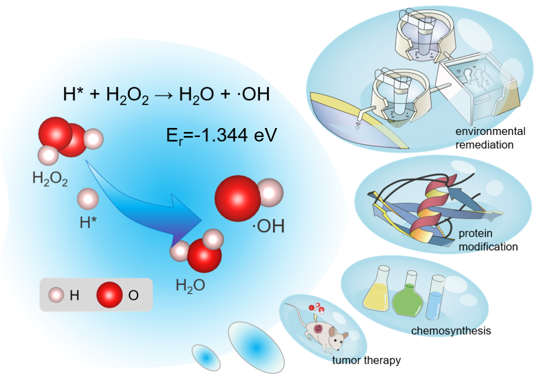 作为一种绿色的强氧化性自由基,羟基自由基被广泛用于水净化,化学合成,蛋白质修饰和癌症治疗等研究领域中。以各种过渡金属为媒介,双氧水的单电子还原可以产出大量的羟基自由基,但是过渡金属活化剂的大量使用随后带来了大量的副产物,为后续的工艺带来了各种麻烦,比如:污水处理中的铁泥处置问题;化学合成和蛋白质修饰中的后续纯化;以及癌症治疗过程中过渡金属离子的毒性问题。因此,寻找一种不会产生任何副产物的活化剂成了解决芬顿过程的副产物问题,扩展芬顿过程应用范围的当务之急。