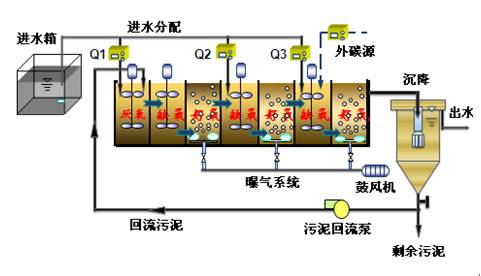 分段进水脱氮除磷工艺的工艺方式有:四段式A/O分段进水脱氮除磷工艺、A2/O分段进水工艺和改良UCT分段进水深度脱氮除磷工艺。技术特点主要体现在以下三个方面: