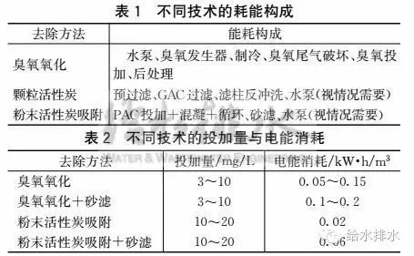 以相同去除率为前提,臭氧氧化的一次能源消耗要低于活性炭吸附,但是臭氧制备所消耗的电能会增加水厂总能耗20%~40%。