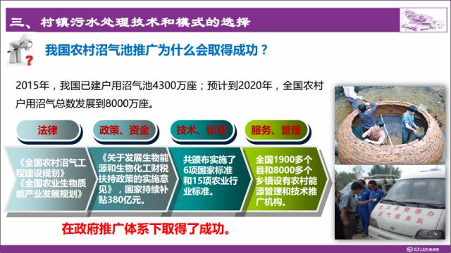 2015年底,我国已建户用沼气池4300万座;预计到2020年,全国农村户用沼气总数发展到8000万户。从法律上,有《全国农村沼气工程建设规划》《全国农业生物质能产业发展规划》;在政策和资金支持上,国家累积投入380亿元,提供了强大的资金支持;在技术、标准上,共颁布实施了6项国家标准和15项农业行业标准。对比来看,农业部针对一个小小的沼气池就制定了将近20项标准,而我们做了这么多年村镇污水处理,才制定了几项村镇污水的标准,这是我们技术界的失职。与此同时,沼气池建立了相当一部分服务体系。农村沼气借助能源推广、技术推广、机构推广,体制保证了4000多万座沼气池的建设,并且相当一部分的沼气池运行很好。虽然现在由于农村的建设、农业结构的调整、生活水平的提高等一系列的原因使用量减少了,但是在适宜的地方沼气池仍然起很大的作用。农村的污水处理,不管是分散到户还是到村,跟农业部比我们都差很远。自己行业没有做到家,国家也没有呼吁到位。国内-我国三格化粪池为什么会取得成功?