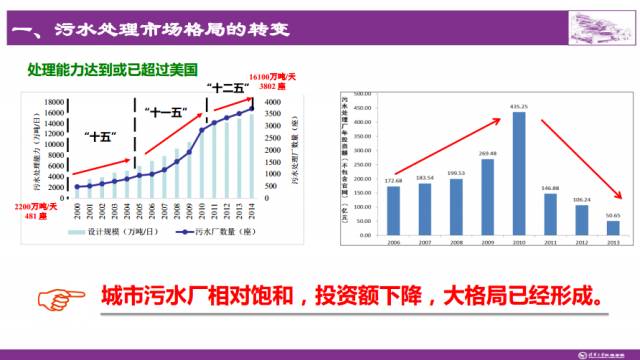 我国从“十一五”进入城镇污水处理的高速发展期。“十一五”期间增长非常快,可以说是超常规发展。到“十二五”期间,年均投资额度已经下降了。此时城市污水的市场已经趋近饱和,大格局已经形成。