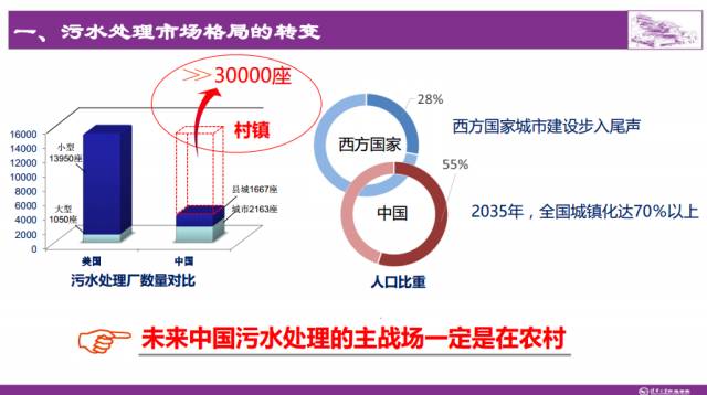 未来中国污水处理的主战场一定是在农村。村镇污水处理应该不依赖技术本身,而依赖于商业模式;不能仅仅依靠市场化,而应以政府为主导。