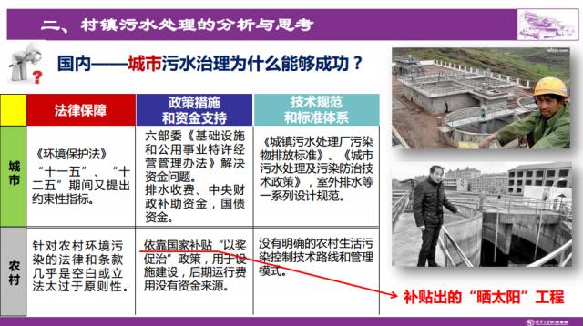 从国内城市污水治理的成功经验或许可以给到村镇污水处理一点启示。从法律保障来看,90年代,虽然有环保法、水污染法,却没有明确的规定,城市污水并没有很快发展。而“十一五”“十二五”期间,人大定的法律,把COD和SO2作为约束性指标,这是促使城市污水治理快速发展的最主要原因。此外,在政策措施和资金支持上,六部委联合发布的《基础设施和公用事业特许经营管理办法》,推行特许经营模式,引入社会资本参与公用事业,解决了资金问题。此外,排水收费、国债以及中央财政也给与很大支持。在技术规范和标准体系上,《城镇污水处理厂运行监督管理技术规范》、《城镇污水处理厂污染物排放标准》、《城市污水处理及污染防治技术政策》、《城市污水处理及污染防治技术指南》等一系列技术规范和标准体系的确立与实施,也是助力城镇污水发展的重要原因。对比这三个方面,农村污水处理确实存在一些问题:针对农村环境污染问题的法律和条款几乎是空白,立法太过于针对原则性、执法机制不健全;依靠国家补贴、“以奖促治”政策支持,主要用于设施建设,后期运行费用没有资金来源;没有明确的农村生活污染控制技术路线和管理模式等因素,导致补贴出来的自然是“晒太阳”的工程。