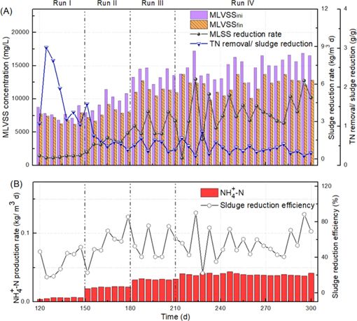 图3 120-300天发酵反硝化反应器运行情况:(A)MLVSS浓度、污泥减量化速率以及总氮去除与污泥减少关系;(B)污泥减少与NH4+-N释放比-来自原文