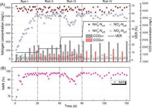 图2 氮素转化及COD去除情况(A);0-150天短程硝化反应器NO2--N积累率(B)-来自原文