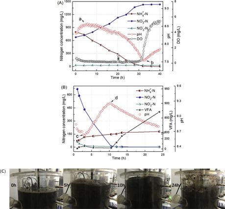 图4 第300天一个典型周期内NH4+-N、NO2--N、NO3--N、pH和DO参数在短程硝化反应器(A)与发酵反硝化反应器(B)变化情况;(C)发酵反硝化反应器实际装置-来自原文