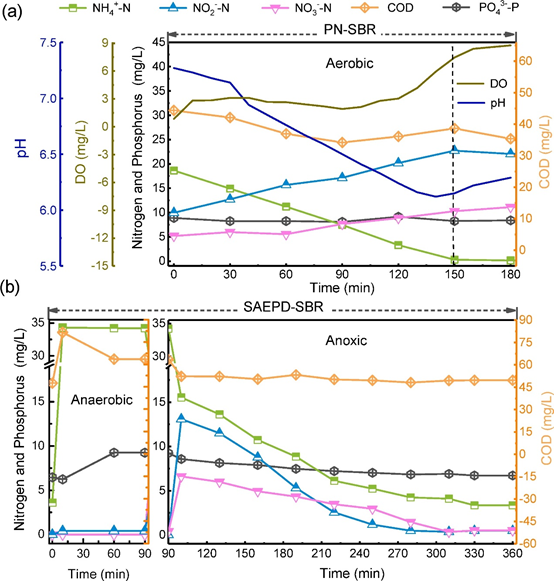 图4. 在一个标准的循环周期中(第189天),PN-SBR中营养物质浓度、pH和DO的变化(a);SAEPD-SBR中营养物质浓度的变化(b)-来自原文