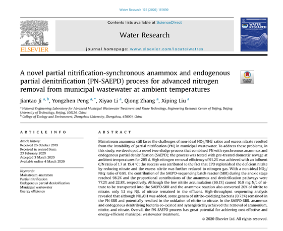 原名:A novel partial nitrification-synchronous anammox andendogenous partial denitrification (PN-SAEPD) process for advancednitrogen removal from municipal wastewater at ambient temperatures