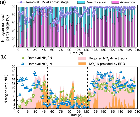 图3.PN-SAEPD缺氧阶段对TIN去除的贡献率以及缺氧阶段厌氧氨氧化和反硝化对TIN去除的贡献率(a);在SAEPD-SBR缺氧阶段去除的NH4+-N和NO2—-N、所需理论NO2—-N和EPD产生提供的NO2—-N(b)-来自原文