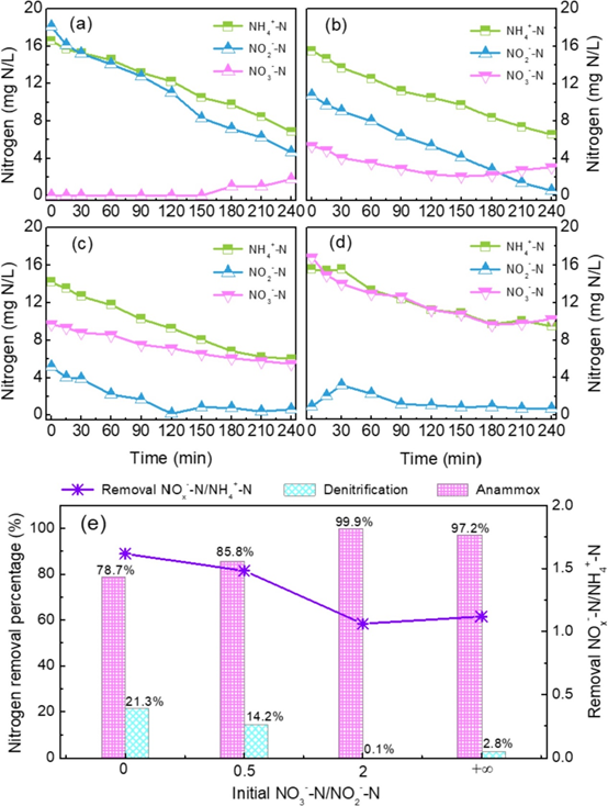 图5.缺氧批量实验中含氮物质浓度的变化,初始NO3—-N/NO2—-N比分别为0(a)、0.5(b)、2(c)和+∞(d);每组批量实验中,NOx—-N/NH4+-N的去除比、厌氧氨氧化和反硝化贡献的脱氮率(e)-来自原文