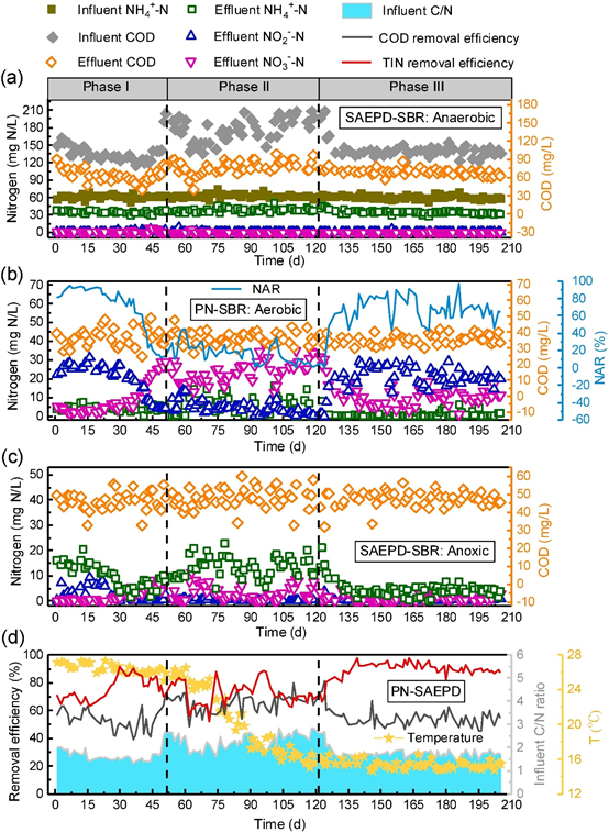 图2. SAEPD-SBR和PN-SBR的进水和出水中COD、NH4+-N,NO2−-N和NO3−-N浓度;PN-SBR的NAR、温度和进水C/N比;PN-SAEPD的TIN去除效率和COD去除效率-来自原文