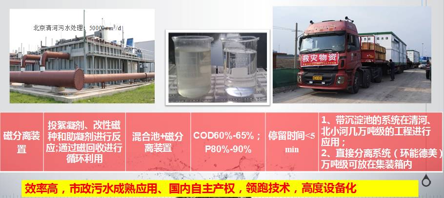 另外我国有很多技术一旦沿着这个路线来发展,技术的路径就会打开,有很多污水处理以前不能考虑的问题,现在就可以考虑了,所以说是技术大繁荣。比如说磁分离技术,作为污水处理的浓缩工艺,在技术上,实际上已经成熟了。奥运期间清河污水厂的装置都是作为一级装置来用的。去年天津大爆炸发生后,王凯军教授调用了一台设备到现场,两个集装箱就装下了。三到五分钟的停留时间就能够达到60%到80%的COD去处量,这是非常难得的。
