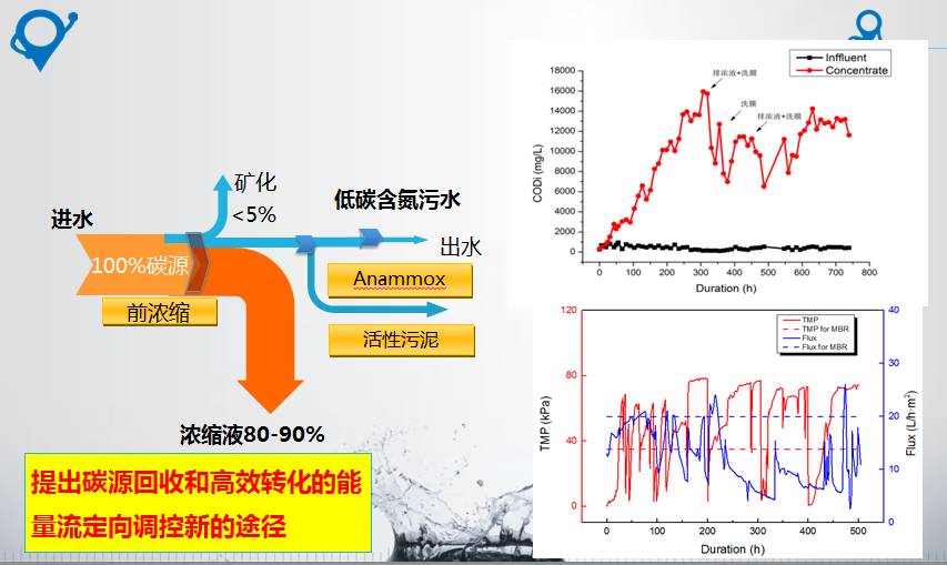王凯军介绍,多年前参加了一个讨论会,他开始想试试用膜浓缩技术,做了七八年的研究,可以称的上是一次革命。从0.33m3小试到1m3小试再到24m3组件中试,现在已经有了100t/d膜组件。利用MBR或膜过滤结合混凝强化实现有机物分离,COD去除率可以从70%到90%。