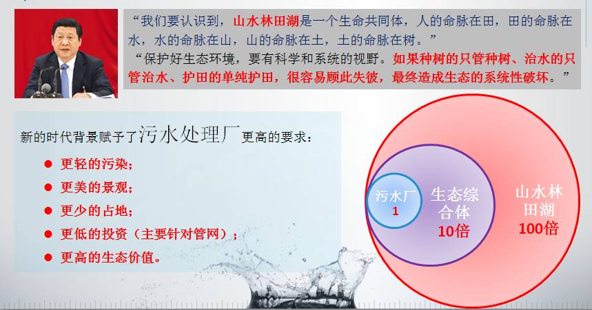 从这个角度讲带来很大的行业发展。我们讲生态综合体经济体量达到十倍,如果再进一步按照习总书记提出的“山水林田湖”的概念,它的体量就会达到100倍。新的时代背景赋予了污水处理厂更高的要求:更轻的污染;更美的景观;更少的占地;更低的投资(主要针对管网);更高的生态价值。这个体量实际还带来了行业的进步。行业不仅要考虑污水处理的问题,还要考虑景观问题以及社会发展问题。只有这样才能引导行业的发展。
