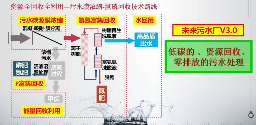 当然很多人会说这是一个能耗型的污水处理,但是以汽车的发展来看这是一个过度的阶段,所以把它称为2.0版的时代。虽然最终推行的是新能源汽车,但是电动汽车或者混合动力车属于过渡阶段,满足了一段历史时期的社会需求。未来污水厂3.0版,资源回收的工艺可能起到重要的作用,所以未来3.0工艺是低碳的、资源回收和零排放的污水处理,从整个流程可以看出,完全零排放的路径。