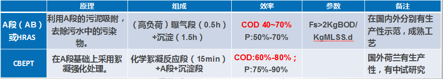 所以看到国外有的污水厂也用了以生物吸附段为基础的工艺,总结起来国外基本上采用AB段,或者A段,或者A段的基础上采取强化,COD的去处率从40%到60%,从50%到70%,最高的可能达到80%。A段生物吸附(或HRAS)+化学絮凝工艺欧美拟采用的主要技术选择,诸如奥地利STRASS厂和荷兰Rotterdam-Dokhaven厂等。