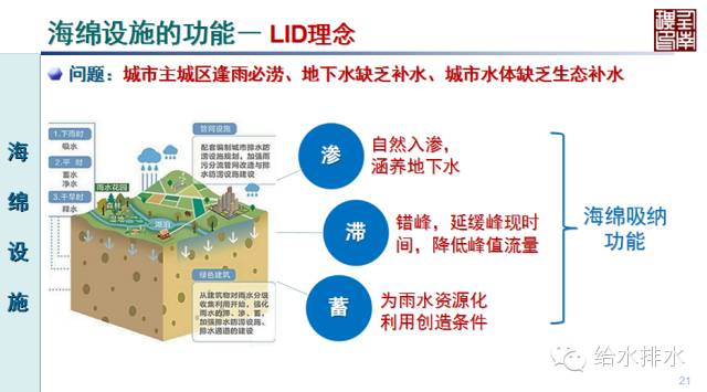 低影响开发(Low-Impact Development, LID):概念是采取土地规划和工程设计的方法来管理雨水径流 。LID强调现场自然属性的保持和利用,从而保护水质—From Wikipedia。