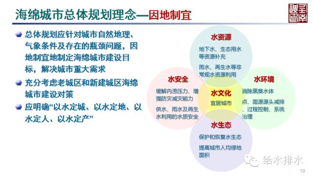 总体规划应针对城市自然地理、气象条件及存在的瓶颈问题,因地制宜地制定海绵城市建设目标,解决城市重大需求;充分考虑老城区和新建城区海绵城市建设对策;应明确“以水定城、以水定地、以水定人、以水定产”。