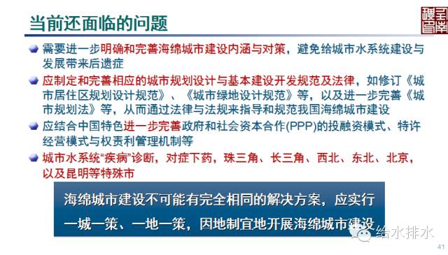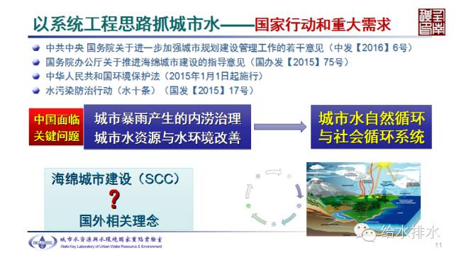 城市水规划严重缺失:以系统工程思路抓城市水——国家行动和重大需求。应以国务院办公厅关于推进海绵城市建设的指导意见(国办发〔2015〕75号)作为指导。目标:加快推进海绵城市建设,修复城市水生态、涵养水资源,增强城市防涝能力,扩大公共产品有效投资,提高新型城镇化质量,促进人与自然和谐发展。工作目标:通过海绵城市建设,综合采取“渗、滞、蓄、净、用、排”等措施,最大限度地减少城市开发建设对生态环境的影响,将70%的降雨就地消纳和利用。由于中国目前面临的特定发展时期,以及城市水资源与水环境状况,“海绵城市建设”应符合中国国情!