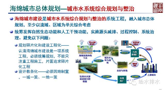 要统筹发挥自然生态功能和人工干预功能,实施源头减排、过程控制、系统治理。避免以下问题:规划碎片化和建设工程化,要认清海绵城市建设是一项系统工程,必须统筹规划,不能只注重工程施工,片面追求碎片化工程;设计教条化,必须因地制宜,一城一策、一地一策。