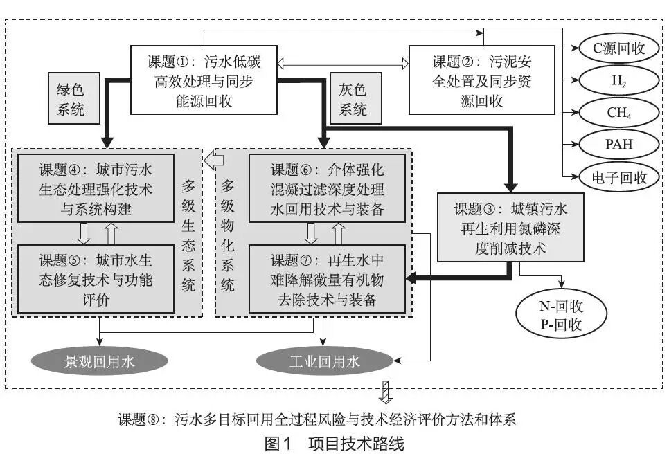 2016年8月,国家重点研发计划“水资源高效开发利用”重点专项“城镇污水高效低碳资源化利用技术集成与示范”项目正式启动。该项目针对城市工业、景观生态等再生水利用需求,基于“产品”与“生态服务”一体化的研发思路,以建立“绿色”+“灰色”的耦合城市污水处理、多目标回用技术系统为总目标,开展城镇污水低碳、安全、资源化利用及风险评估技术研究。形成加强型生态修复与恢复技术体系,研发新型节能污水生物处理及污泥安全处理处置技术、再生水中微量有机物削减技术与装备等,建立污水处理多目标回用全过程风险与技术经济评价方法和体系,完成示范工程建设与运行。污水回用既可以有效地节约和利用有限的和宝贵的淡水资源,减少污水或废水的排放量,缩小水循环的空间范围,可减轻水环境污染,还可以缓解城市排水管道的超负荷现象,具有明显的社会效益、环境效益和经济效益。 该项目由哈尔滨工业大学牵头,联合北京大学、中国科技大学、天津大学、北京工业大学、中科院地理科学与资源研究所、北控水务等14家单位共同参与,项目负责人为任南琪院士,由城市水资源与水环境国家重点实验室副主任冯玉杰教授协助任南琪院士进行项目具体实施。开展时间为2016年7月至2020年12月,专项经费3500万元,设置8个课题,项目技术路线见图1。 项目围绕“城市污水处理过程中物质流与能量流内在机制,首次提出“灰色”+“绿色”的高效污水处理及回用系统,设置如下研究内容: