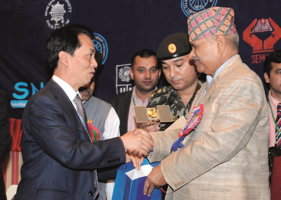 在第三届气候变化主题与环境发展可持续化国际会议上,尼泊尔副总统与任南琪院士亲切交流