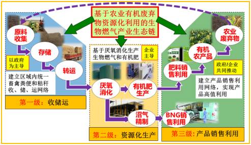 (2)生物燃气发展促进农业产业升级。以生物燃气产业发展带动区域养殖、种植、肥料、燃气等行业的优化与升级,最终构建以“农业废弃物收储运-资源化处理-产品销售与利用”三级网络为核心的良性产业生态圈。