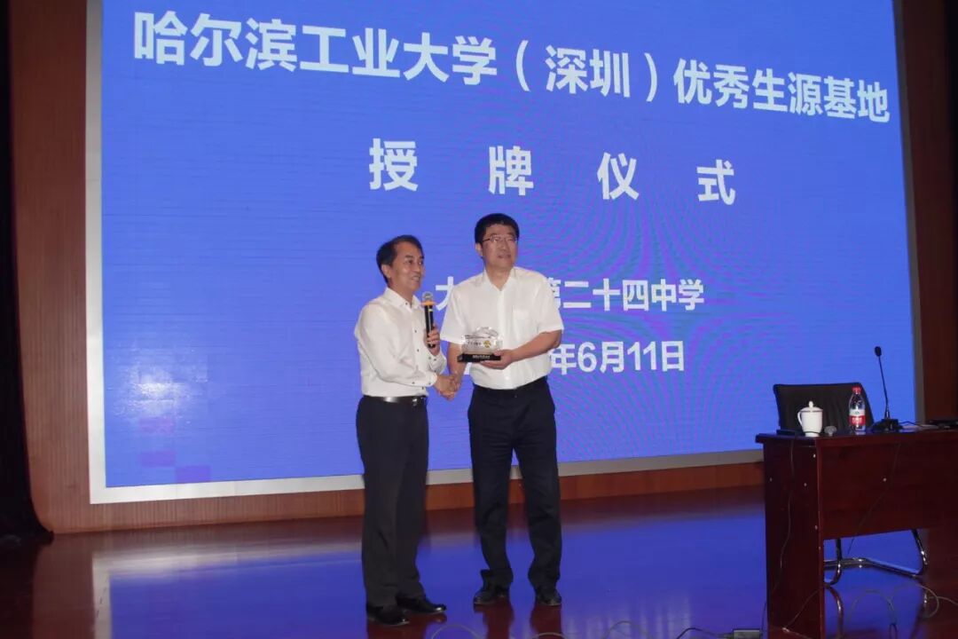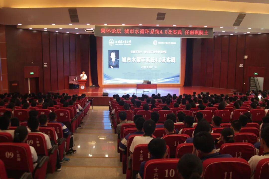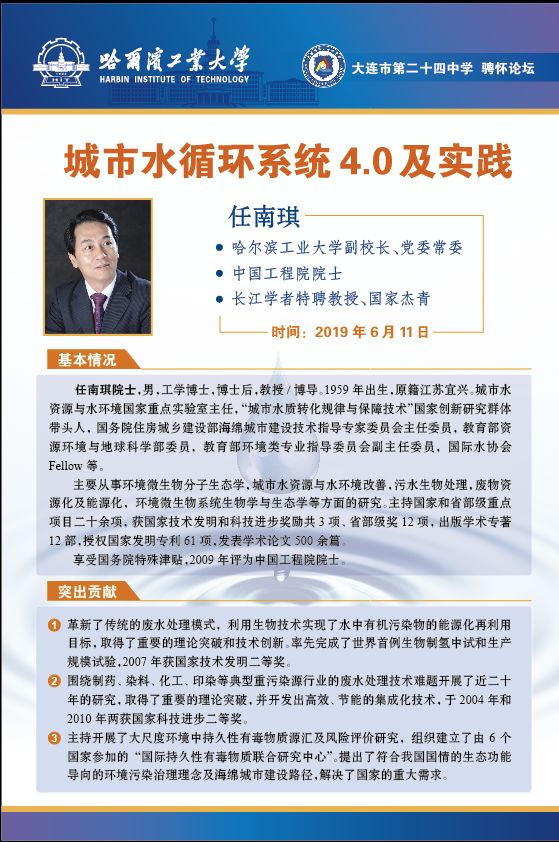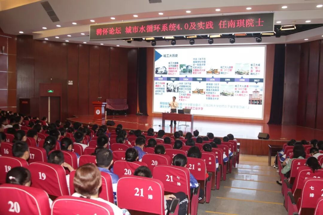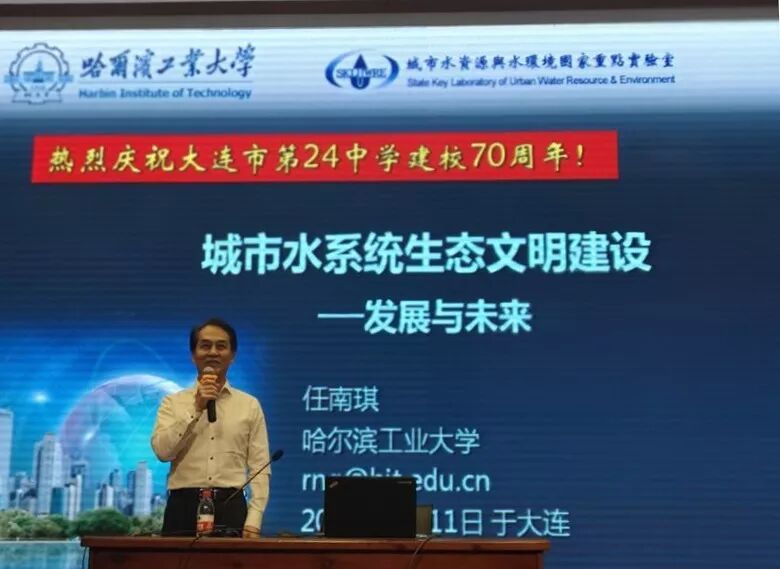 任南琪院士首先对二十四中学建校七十周年表示了祝贺。随后,他从个人专业出发讲述了自己的教育经历和工作经历,他认为,特长和爱好对一个人的成长十分重要,在面对实际问题时,理论和实践结合往往能找到最适合的对策。他介绍了目前国家面临的重大需求和主要问题。通过介绍,大家真切地感受到了目前城市水安全与水环境问题的日益严峻,“水资源短缺,水环境污染,水生态破坏”,城镇化建设的推进过程中,面临着诸多风险。深入浅出的讲解让同学们感受到的是一位院士心系万千水土的家国情怀。任院士倡导弘扬习总书记“自然,生态,绿色”理念,认为“良好的生态环境是最普惠的民生福祉”,告诫同学们“生态兴则文明兴,生态衰则文明衰”,他深入解读了生态环境理念和海绵城市的内涵,循序渐进地引出海绵城市建设发展的实践历程。城市水循环建设1.0到4.0,由最原始的自然净化,到如今建成既能够发挥自然系统的“渗、滞、蓄”作用,又能与人工强化功能作用中的“净、用、排”相结合,实现城市水资源与水环境的综合整治。讲座不仅彰显了任院士的卓识和远见,更体现了一位科学家的责任与担当。最后,任院士向同学们介绍了哈尔滨工业大学的历史沿革、发展现况、辉煌成果等内容,当提到航空航天领域的杰出成就时,引发了全场一阵阵热烈的掌声。 两个小时的讲座,体现了一位科学家完备的知识体系,不断求索的创新精神,致力于社会公益的宽广胸襟。这不仅是一场生动的科普课,更让同学们理解了城市治理、生态环境改善的的任务与措施需要一代又一代的青年继承和发展。任重而道远,臻于至善,矢志不渝。 报告结束后,举行了授牌仪式。黄启成校长代表学校接受了哈尔滨工业大学授予大连二十四中学“优秀生源基地”的奖座。