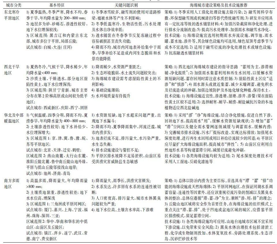 我国海绵城市建设的试点城市遍布全国,通过实践积累了大量的可复制可推广的经验。为了使后续的海绵城市建设在大面积推广时更好地对标可借鉴的范式,本文依据城市的自然地形、气候以及地域分布特征,对试点城市进行以下分类:东北寒冷平原地区、西北干旱地区、华北及中部暖温地区和南方多雨地区。通过对试点城市的特征解析,识别共性的关键问题,分类归纳总结了海绵城市建设策略并推荐了适用的技术设施。