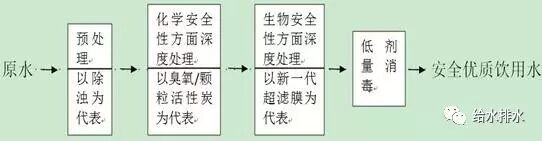 在上述水处理工艺中,水中致病微生物、有机污染物以及浊度等,经流程中各处理单元被逐级除去(多级屏障),从而使水在生物安全性和化学安全性两方面都得到深度处理,从而获得安全清澈优质的饮用水。