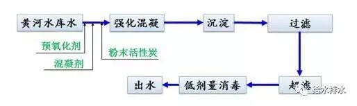 实例2:在常规处理中增加去除有机物的措施,然后再经过超滤处理(山东模式),山东东营南郊水厂处理工艺: