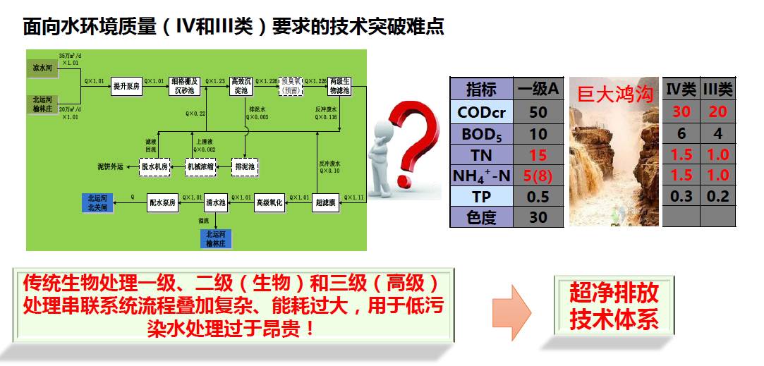 缺乏针对工业废水、城市污水和低污染河道水等系统的超净处理技术是限制我国水环境质量改善的主要障碍。水质标准提升和水环境质量考核,也催生了挑战与变革。我国的水环境管理由标准管理到环境质量管理过程中,存在着巨大的鸿沟。一级A与III类水、IV类水甚至V类水之间,都有巨大的差距。为了填补这一鸿沟,我们提出了超净排放的概念。