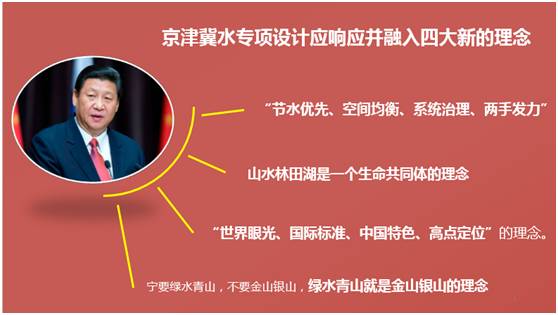 京津冀水专项的设计应响应并融入如下四大新理念。一是“节水优先、空间均衡、系统治理、两手发力”;二是“山水林田湖是一个生命共同体”;三是“世界眼光、国际标准、中国特色、高点定位”;四是“宁要绿水青山,不要金山银山,绿水青山就是金山银山”。