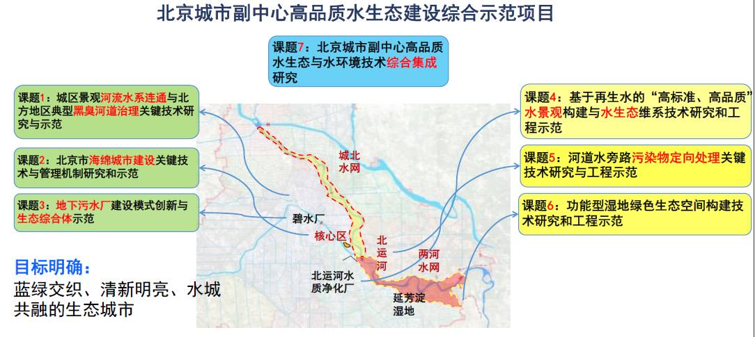 新形势下建设副中心,对水环境、水生态、水安全提出了更高要求,围绕区域水环境治理的综合目标,在污染控制、水质提升、水生态修复方面,开展系列技术攻关。根据目标,科研团队设置了整个课题的技术路线,确定在北运河的核心段,加上与其临近的城北区、两河区和河西区共三个片区,再加上北运河核心段下游的延芳淀湿地,作为主要的研究和工程示范区域,项目共设置了七个课题,分成三大板块。