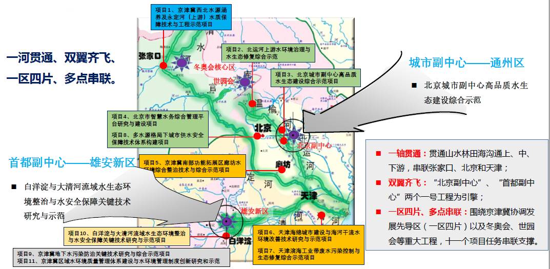 京津冀协同发展区与“一带一路”、长江经济发展带,同属三大国家战略。随着北京城市副中心通州和首都副中心雄安的发展,京津冀协同发展区的发展前景日趋明朗。在水专项十三五选择区域之初,在京津冀协同发展区先行启动区根据“一核”、“双城”、“三轴”、“四区”、“多节点”的战略部署。其中,一核指北京;双城指北京、天津;三轴指京津、京保石、京唐秦;四区指中心核心功能区、东部滨海发展区、南部功能拓展区和西北生态涵养区。在初期布局中,水专项根据上述规划思路,以一河贯通、双翼齐飞,一区四片、多点串联进行顶层设计部署。一河贯通是贯彻山水林田湖(海)思路,沟通上、中、下游,串联张家口、北京和天津;双翼齐飞,“北京副中心”、“首都副中心”两个一号工程为引擎,带动区域发展;一区四片,多点串联是围绕京津冀协调发展先导区(一区四片)以及冬奥会、世园会等重大工程,部署了十一个项目任务。