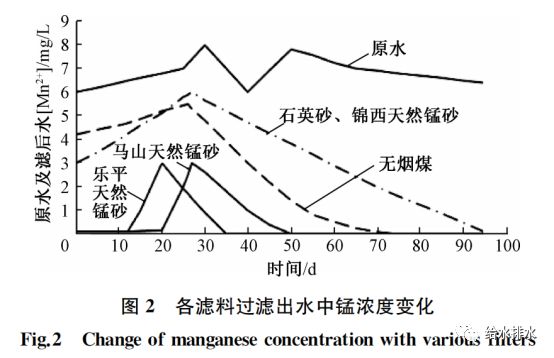 1982年,沈志恒等进行了天然锰砂除铁除锰模型试验,试验采用产于马山、乐平、锦西、宣武等地的锰砂为滤料。试验原水铁浓度1.2
