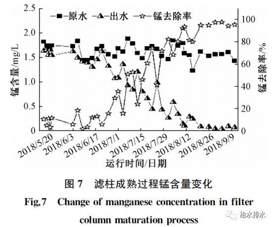 d用青霉素对滤柱进行一次灭菌处理。图7为滤柱的成熟过程。由图可见,在对滤柱持续进行灭菌条件下,锰质活性滤膜也能生成。在此水中溶解氧氧化二价锰生成活性滤膜,排除了生物的作用,主要是化学作用机理。