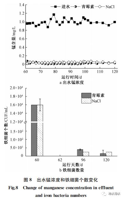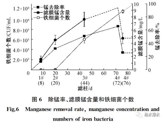 d(8月28日)除锰率达94.7%(出水锰浓度为0.1 mg/L)时,测出铁细菌数量为800
