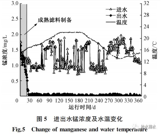 d,成功地制备出涂有MeOx的成熟滤料。之后停止投加高锰酸钾,继续通入原水过滤,滤后水除锰率始终在90%以上。试验滤柱连续运行约一年(2013年3月~2014年3月),原水锰浓度、出水锰浓度、水温变化如图5所示,表明高锰酸钾氧化生成的锰质活性滤膜确实具有持续的接触氧化除锰能力。