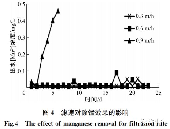 图4为滤速对除锰效果的影响。由图4可见,在该试验中,当滤速较高使吸附速率超过氧化速率时,滤层的锰穿透期只有2.5 d,当滤速较低使吸附速率低于氧化速率时,滤层的锰穿透期超过27 d(试验只进行了27 d),即能持续地除锰。试验证实了滤速对吸附速率的影响。