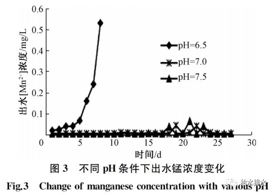 7.0~7.1。试验发现,对于该试验使用的马山锰砂,当进水pH为7.0~7.2时,锰穿透期只有6~10 d;当pH为7.6时,锰穿透期大于49