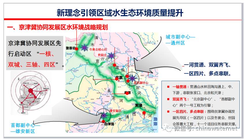 理念引领下,我们在做京津冀协同发展区水环境战略规划时,因此强调“一核、双城,三轴、四区”,一河贯通、双翼齐飞、一区四片、多点串联。