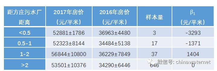 模式创新二:基于地下污水处理厂的城市生态综合体建设模式,以污水厂对房价影响为例分析绿色基础设施的社会价值。基于大数据技术,我们抓取北京市2017年和2016年的房价信息。通过数据净化处理,获取了13710条房屋价格的有效信息。构建基于双重差分法模型,分析地处污水厂不同距离处房价的变化情况,定量分析污水基础设施对周边社区房价的影响。